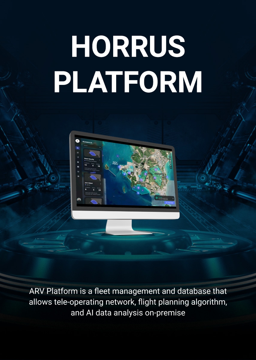 “HORRUS” is Thailand’s first fully automated unmanned aerial vehicle (UAV) system that can perform aerial mission 24/7 with self-maintenance ability in any environment, especially in remote and dangerous areas. The system consists of 3 main technologies that contribute to successful pilot-free mission including an autonomous UAV, a smart ground station, and a software platform.